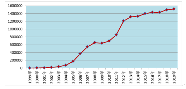2019年全國藥品不良反應監(jiān)測網(wǎng)絡(luò)收到《藥品不良反應/事件報告表》151.4萬份。1999年至2019年,全國藥品不良反應監(jiān)測網(wǎng)絡(luò)累計收到《藥品不良反應/事件報告表》1,519萬份(圖1)。